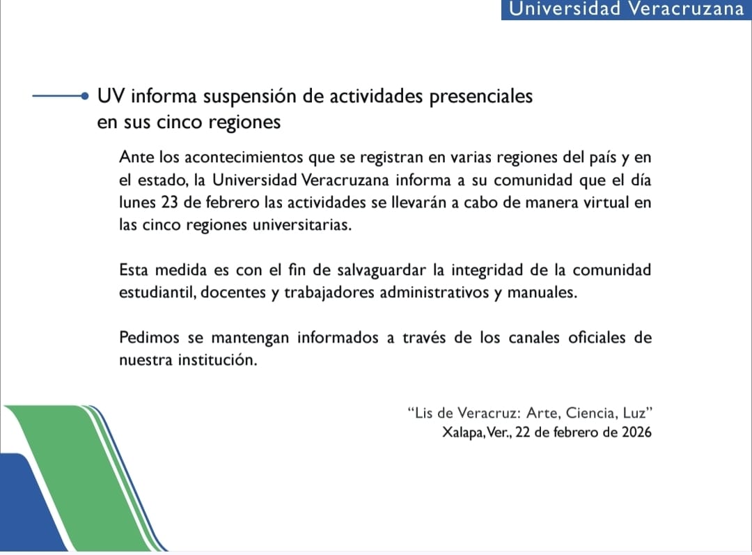 De manera oficial, la Universidad Veracruzana confirma por medio de un comunicado la suspensión de clases presenciales este próximo lunes 23 de febrero en sus 5 regiones, (Campus Xalapa, Veracruz, Orizaba-Córdoba, Poza Rica-Tuxpan y Coatzacoalcos-Minatitlán), debido a los altercados alrededor de la República Mexicana.